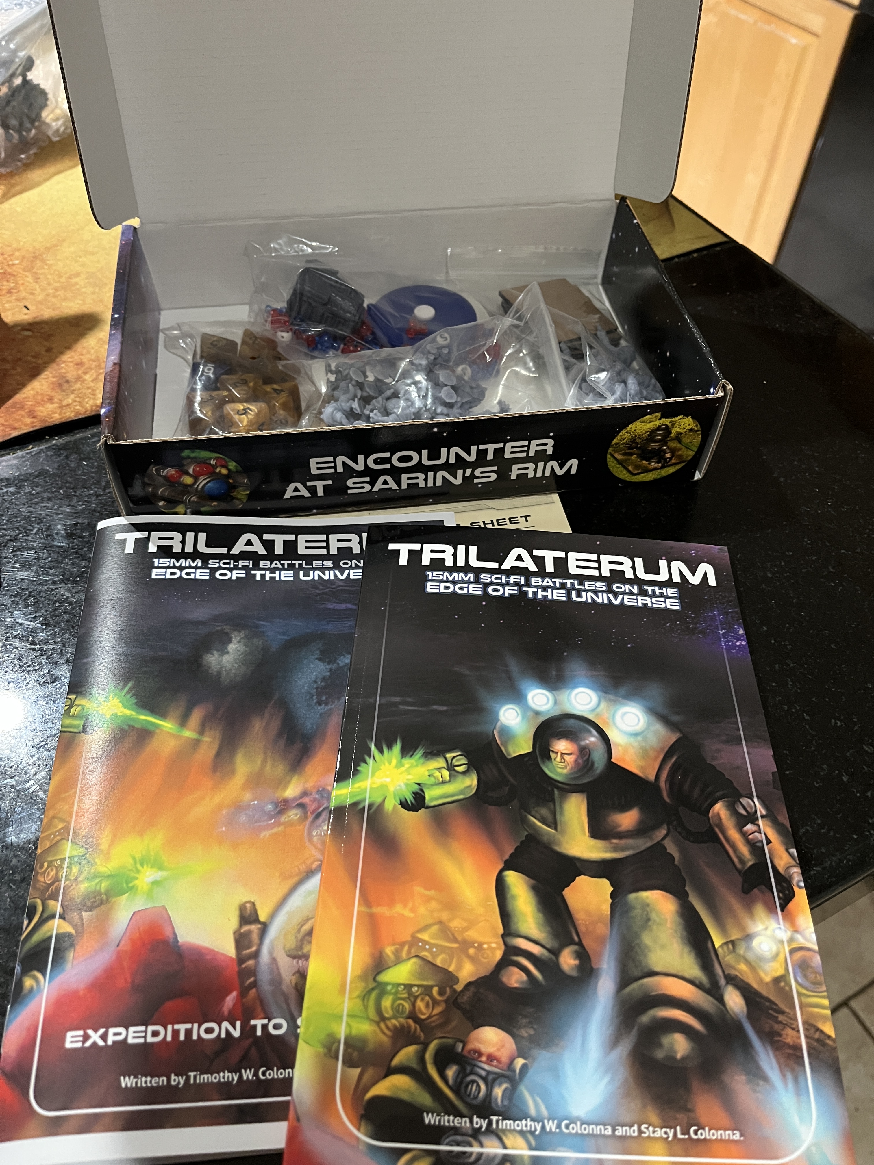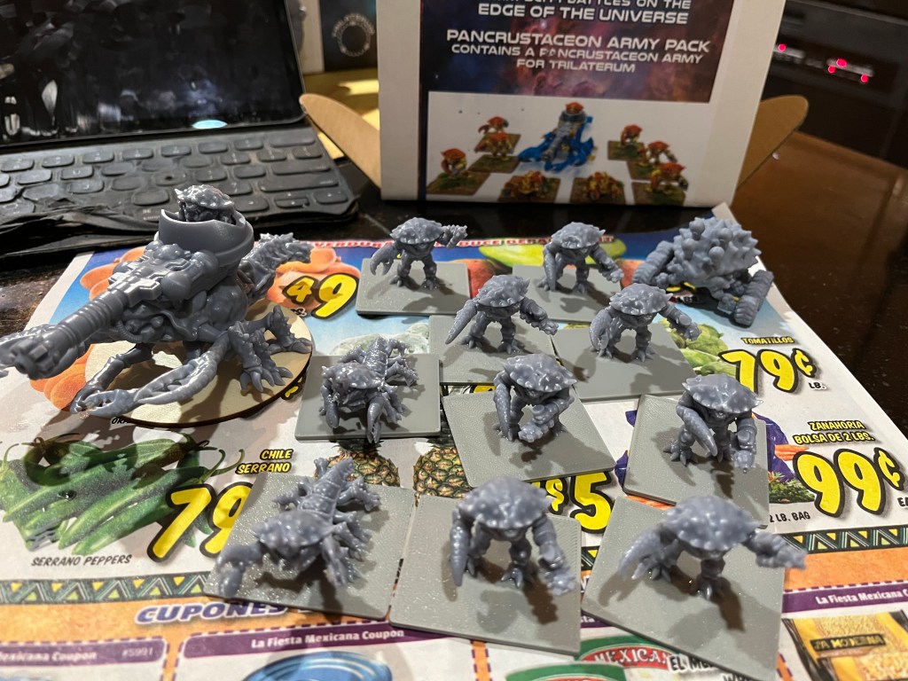 I’ve not been a big 15mm wargamer, but Trilaterum from Trench Coat Miniatures in Massachusetts caught my eye recently. I poked around their website and really liked the look of the minis – not too serious and they looked really flavorful (No, not the eating kind). I ordered up some starters (“Encounter at Sarin’s Rim” along with a couple extra army packs (Gorilla army? Crab and Lobster army? I’m in …).