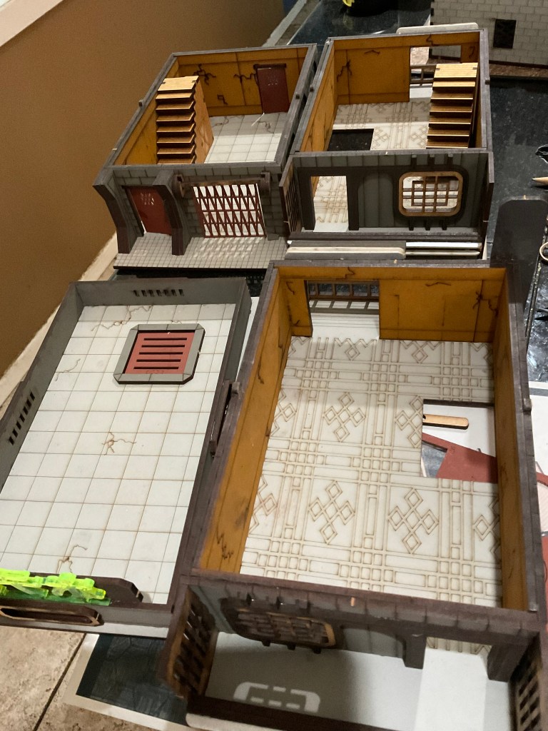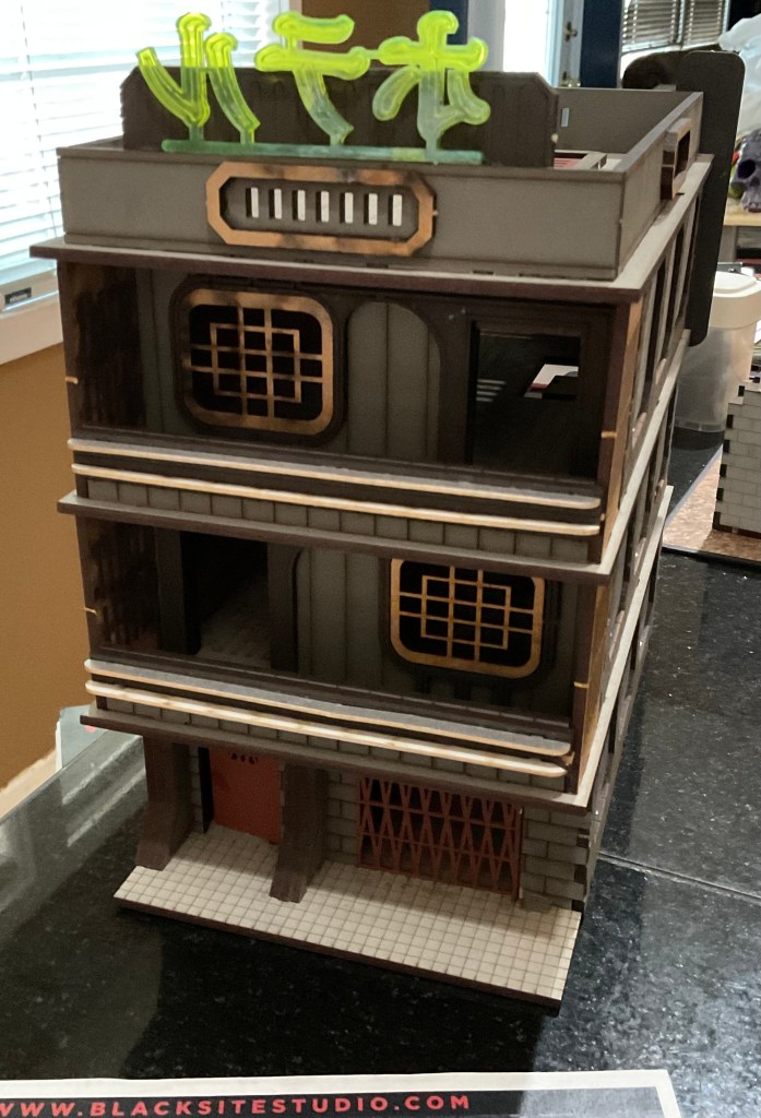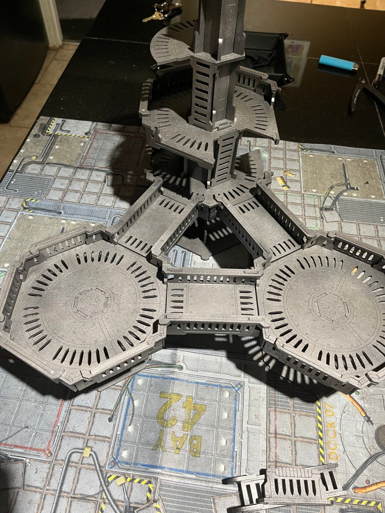 With drop in walls, bridges and ladders, the set is quite configurable. Just this set nicely dominates a 2×2 or 2×3 space (or even centers a 3×3). I think it’s got great value for the cost, and would make an easy center piece or eye catching display for a board. If you’re looking to promote your game, demo, store or club’s sci-fi minis gaming, this would make an excellent piece to get some attention, especially with the main tower standing about 13″ tall.