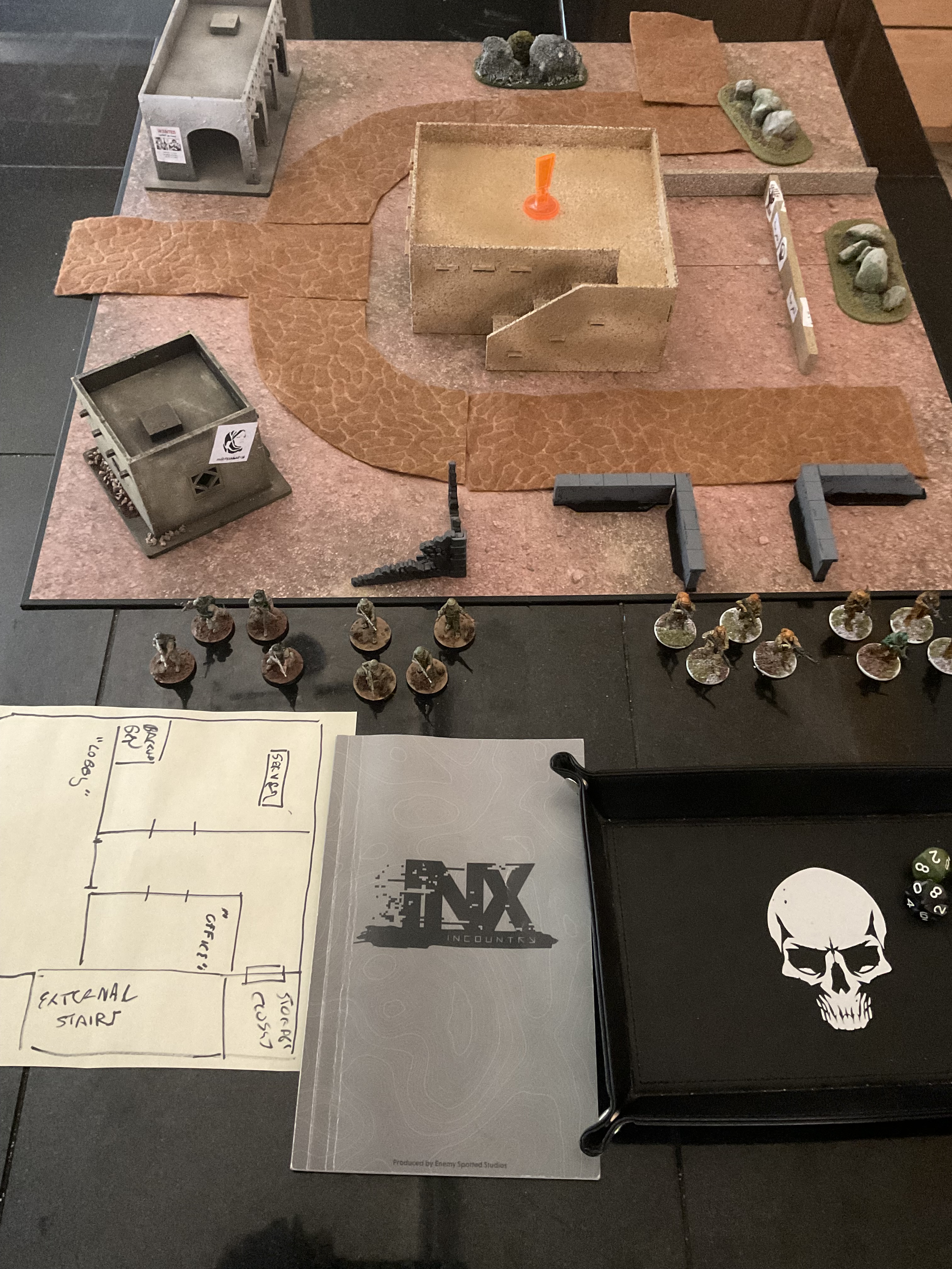 With drop in walls, bridges and ladders, the set is quite configurable. Just this set nicely dominates a 2×2 or 2×3 space (or even centers a 3×3). I think it’s got great value for the cost, and would make an easy center piece or eye catching display for a board. If you’re looking to promote your game, demo, store or club’s sci-fi minis gaming, this would make an excellent piece to get some attention, especially with the main tower standing about 13″ tall.