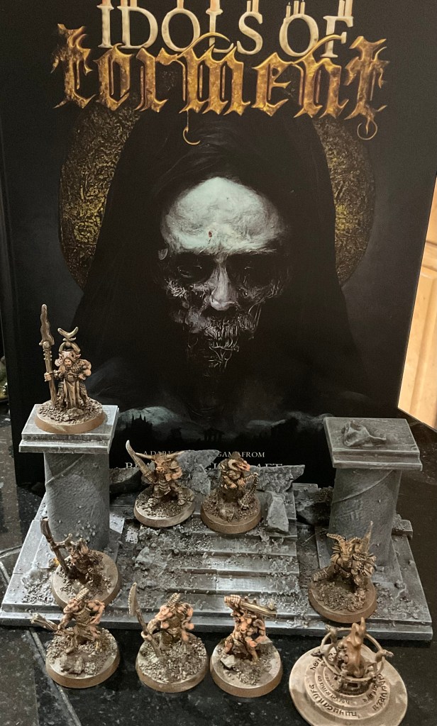 It arrived the other day, and by it, I mean the complete Idols of Torment package. In addition to coming in a nice cardboard box that I’ll probably use for some terrain piece or another, the package was well equipped: gorgeous hardback, set of cards with tokens, bespoke bag with activation tokens and the Lost minis.